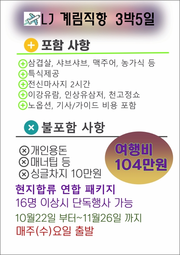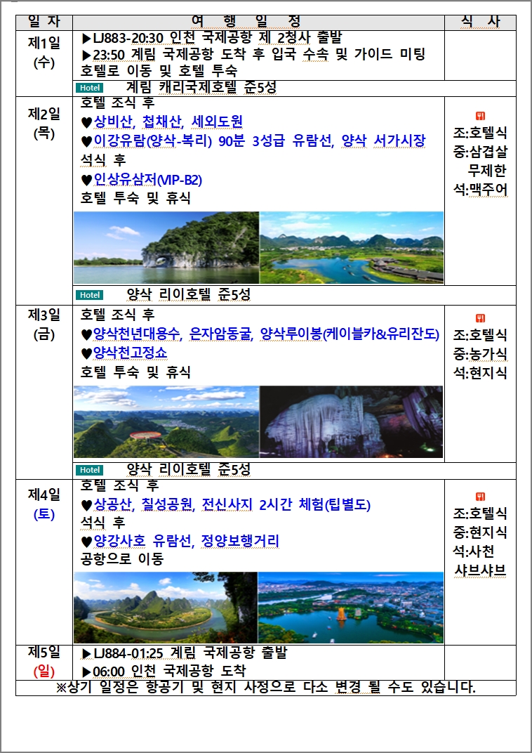 항공여정: 출발 : 인천 2025.10월/11월 (수) 20:50 → 계림 2025.10월/11월 (수) 23:50 LJ883