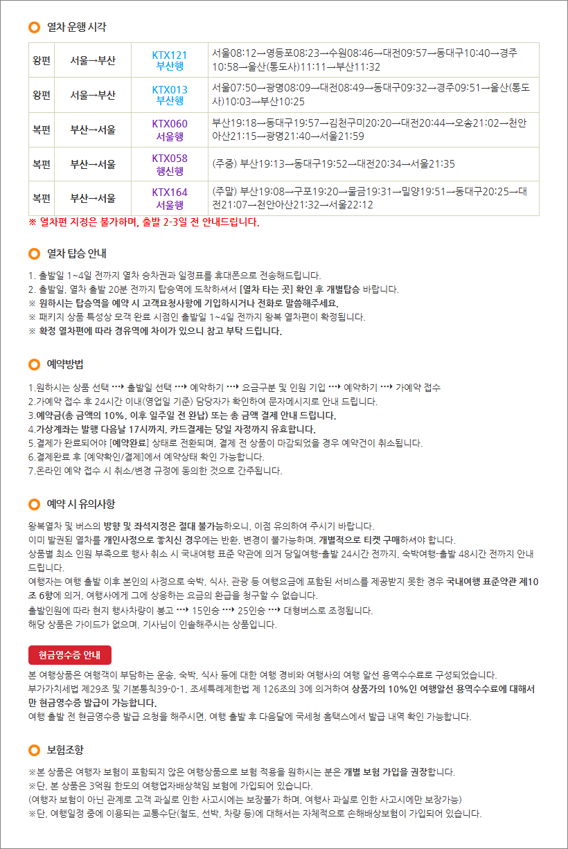 | [비대면 출발 안내] 출발 1~3일 전까지 티켓과 일정표를 휴대폰 메시지로 발송해드린 후 유선 안내드립니다. [열차 개별 탑승] 열차 출발 15분 전, 탑승역 대합실 전광판 열차 타는 곳 확인 후 탑승하시면 됩니다. |
