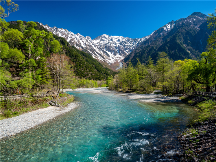 호타카 산의 톱니같이 생긴 산 봉우리와 가파른 절벽, 야케다케 산의 숲과 습지가 장엄한 경관을 만들어 내고, 아주사 강 맑은 물이 골짜기로 흐르고 있습니다.