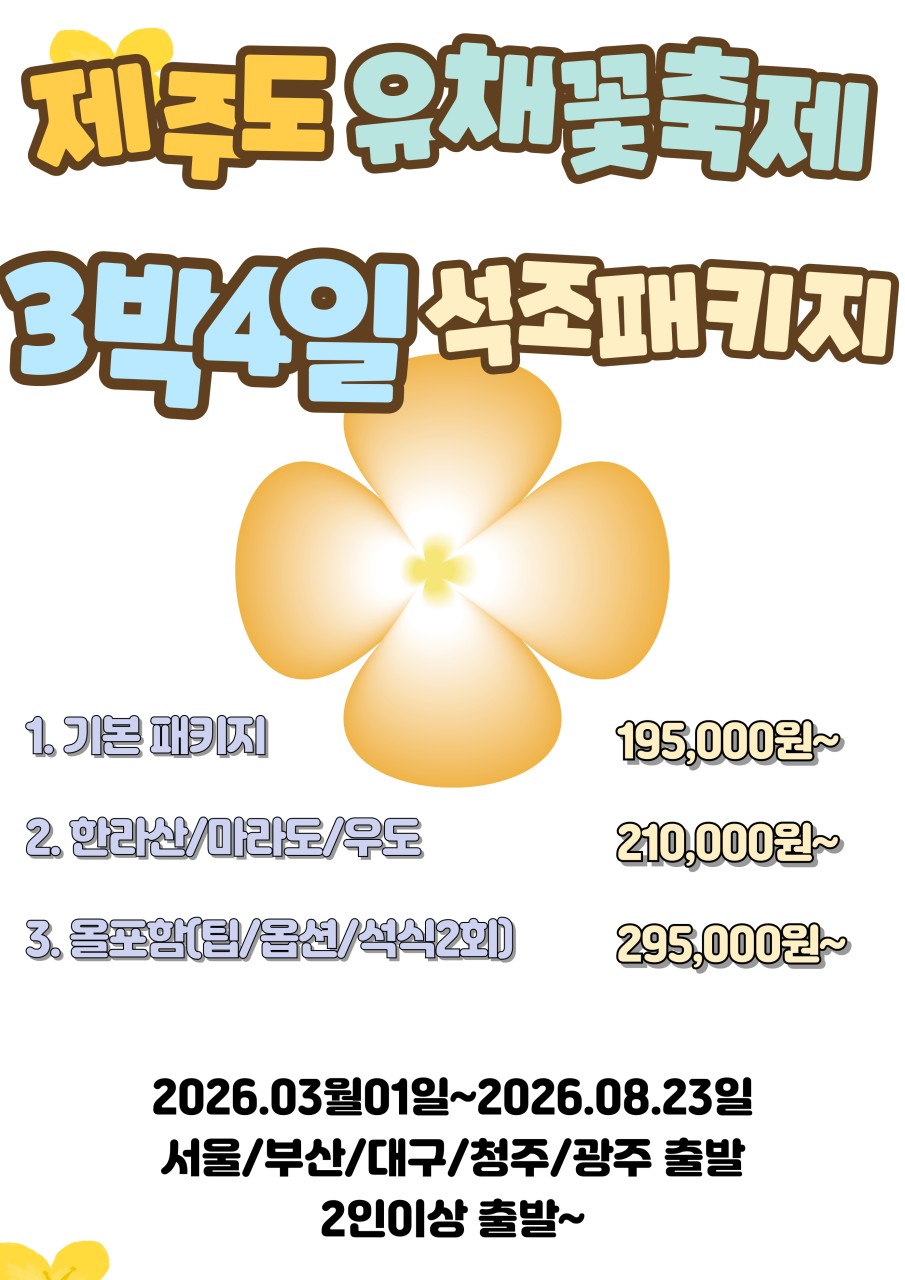 | 2026.03.01~08.23까지 제주도 봄/여름 2박3일 완전정복 패키지 (0) | 2026.02.19 |