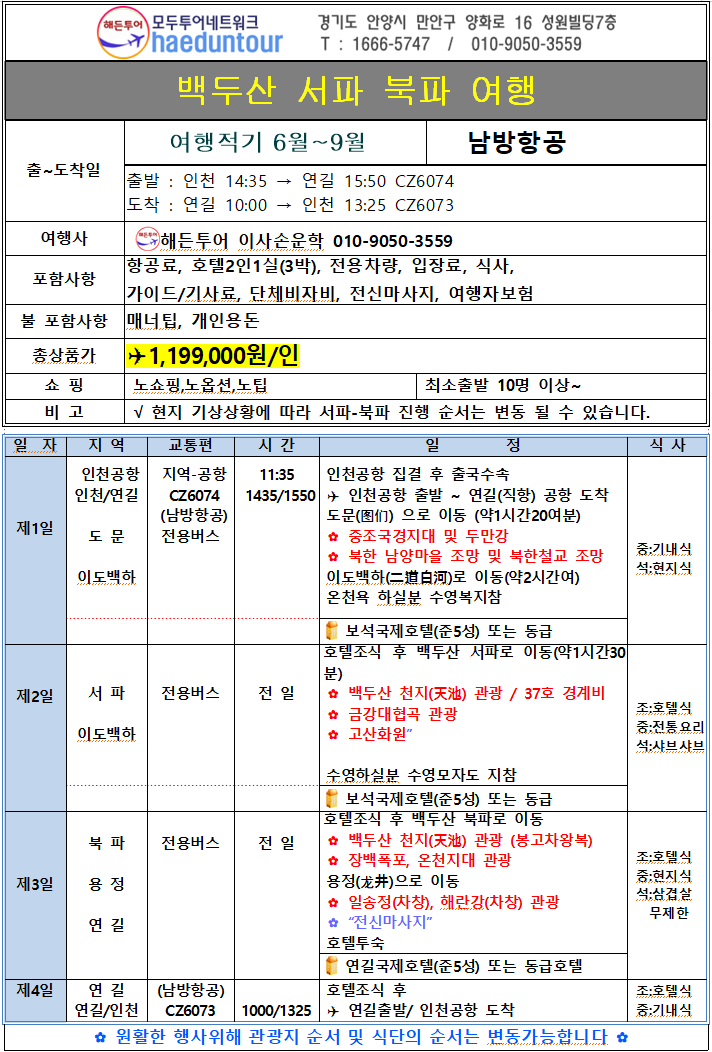 7월 출발 남방항공 연길 백두산 서파+북파+북한라인 3박4일 1,199,000원