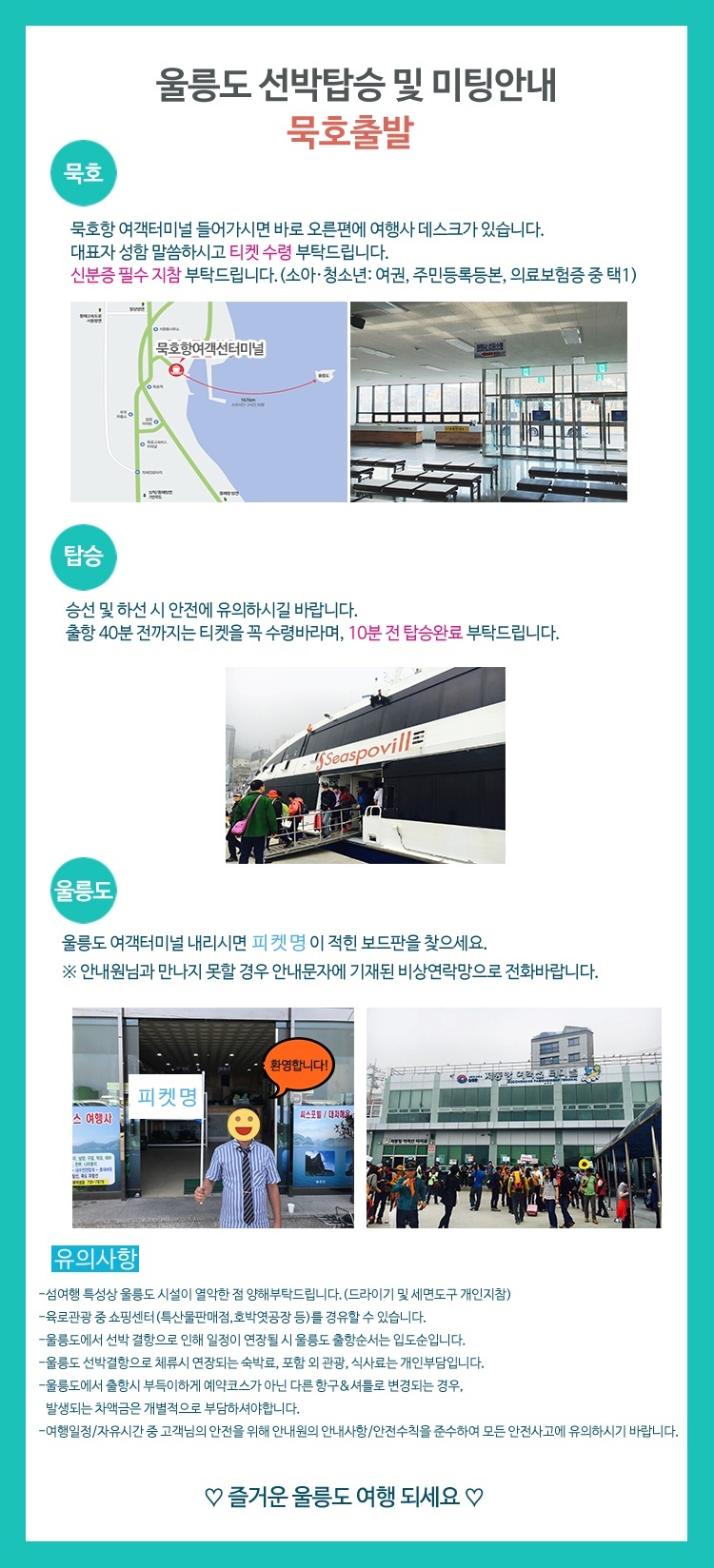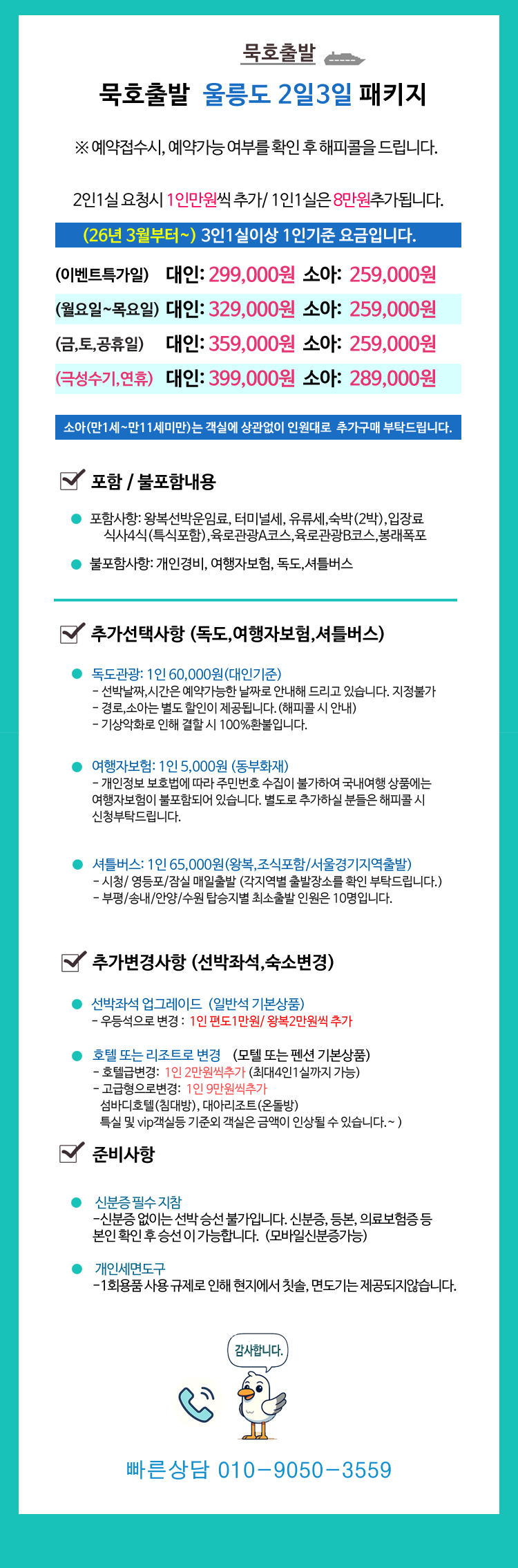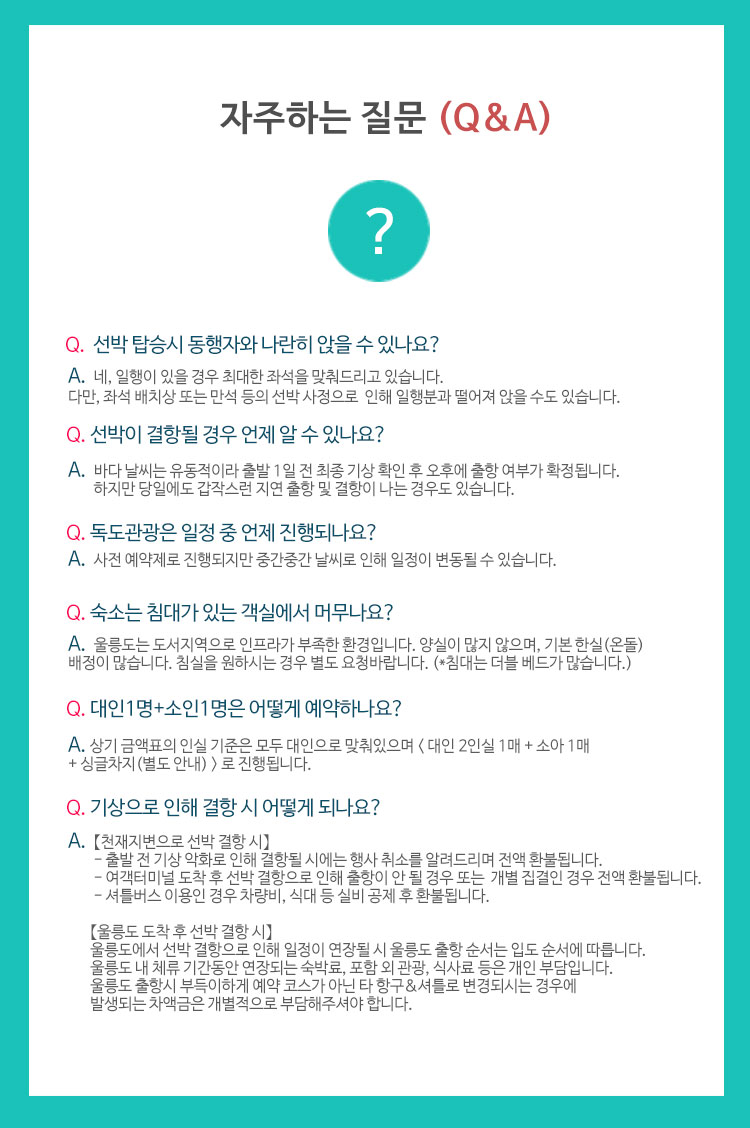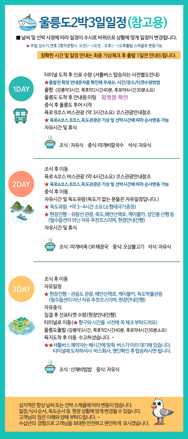 | ★주말,공휴일,연휴기간출항의 경우 예약일자와 상관없이 선박시간이 오전/오전패턴 또는 오후/오후 패턴으로 변경될 수 있습니다. 시간지정은 어려우며, 선박스케쥴상 부득이하게 진행되는 점 양해부탁드립니다. ◎ 상기 일정은 천재지변 및 현지 또는 선박 사정으로 다소 변동이 있을 수 있습니다. 울릉도에서 선박 결항으로 인해 일정이 연장될 시 출항 순서는 고객의 울릉도 입도 순서에 따릅니다. ◎ 천재지변으로 인한 선박 결항으로 일정이 변동될 경우 : * 출발전: 주의보 및 선박 결항시 전화로 행사 취소를 알려드리며, 전액 환불됩니다. * 출발후: 강릉 도착후 선박결항/ 입항이 불가능할 경우 사용하신 실비(버스비+식비)공제 후 환불됩니다. * 체류후: 울릉도 출항 순서는 울릉도 입도 순서에 따르며, 예약 코스가 아닌 다른 항구/ 셔틀로 변경 출항시 발생되는 차액금은 개별적으로 부담하셔야 합니다. ※ 기상악화로 인해 결항시 울릉도 내 체류기간 동안 연장되는 추가비용(숙식료 등)은 개인부담입니다. ※ 선박사정에 따라 선박 입·출항 시간의 변동이 있을 수 있습니다. |