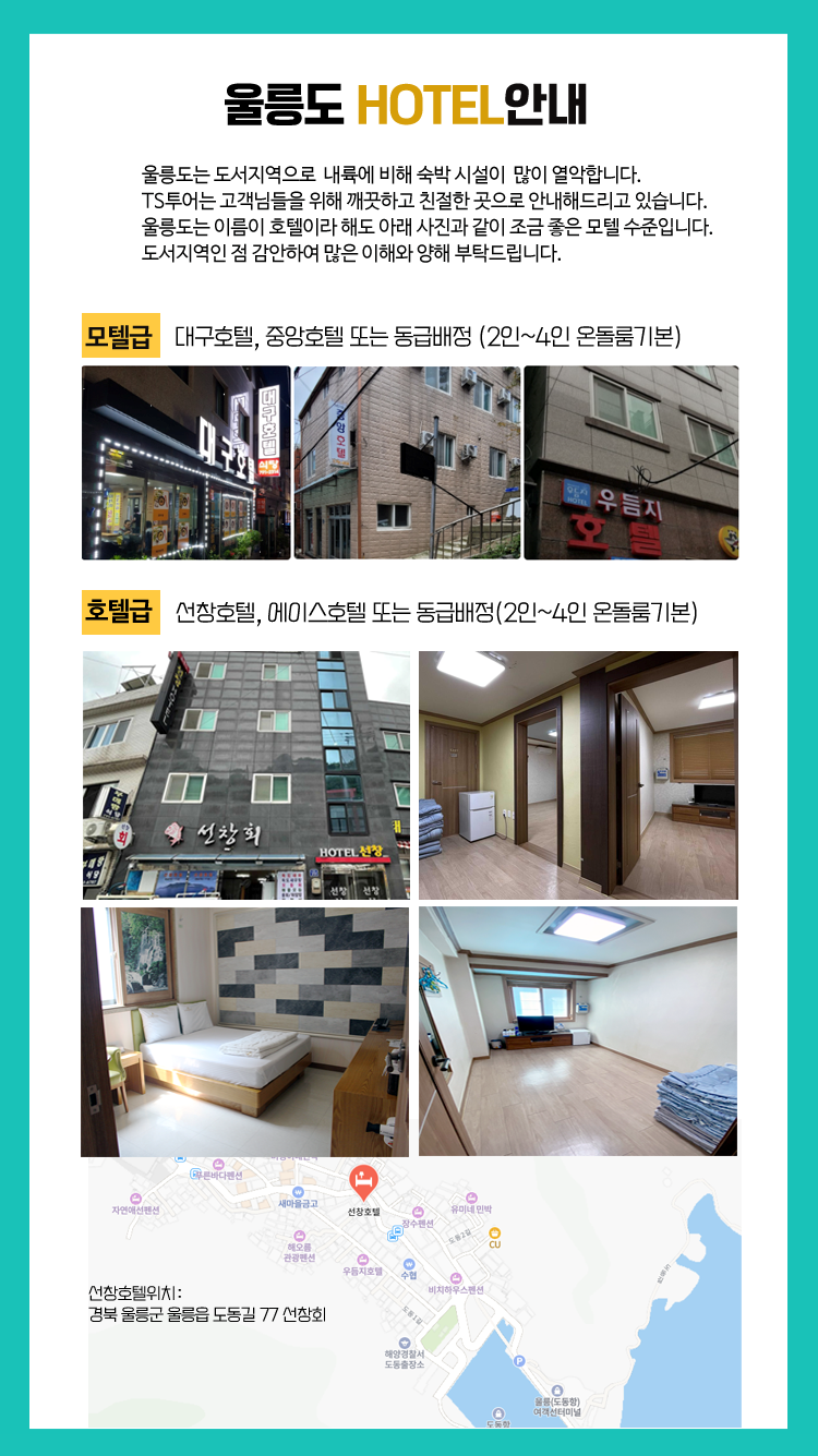 ◎ 울릉도내 숙소(양실,한실)는 랜덤배정되며,숙소변경은 어렵습니다. 양해부탁드립니다.