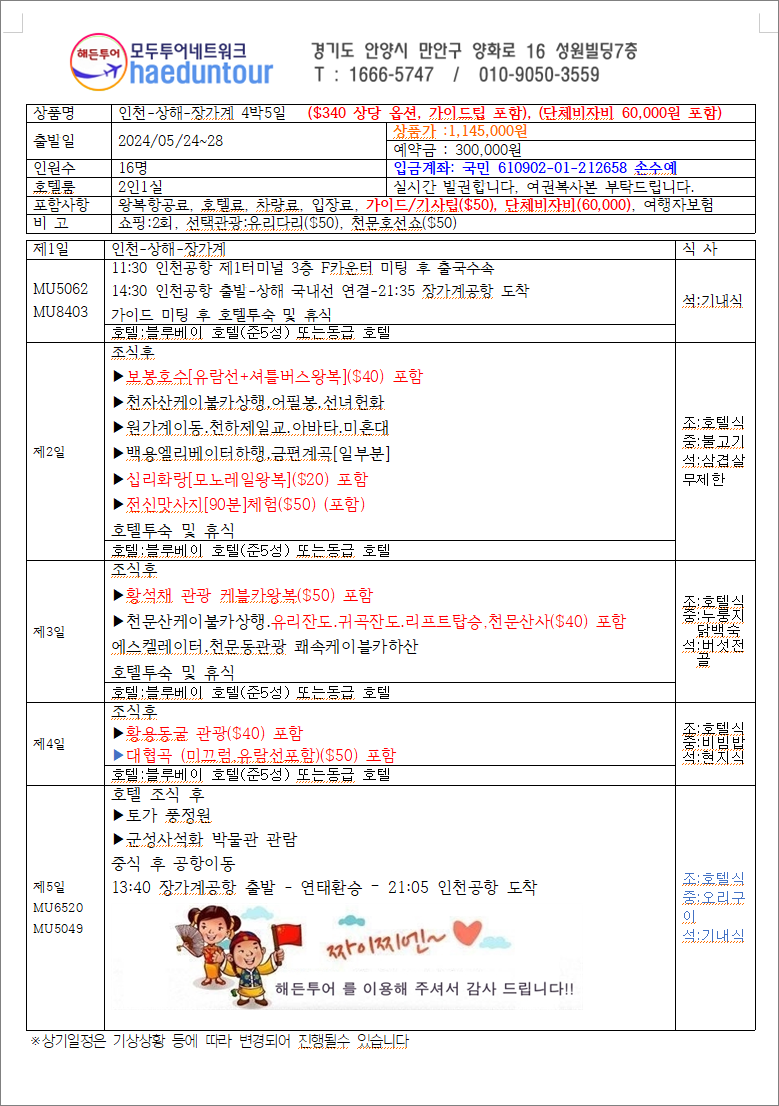 5/24 인천-상해-장가계 4박5일 일정을 만들었습니다.